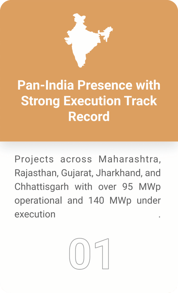 Projects across Maharashtra, Rajasthan, Gujarat, Jharkhand, and Chhattisgarh with over 95 MWp operational and 140 MWp under execution